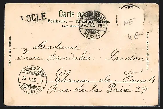 gelaufen 1905, Briefmarke entfernt, rückseitig Oberflächenschaden, Eckknick re. unten, Stempelspur, guter Zustand