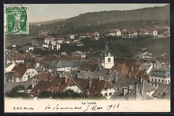 AK Le Locle, Totalansicht mit Turm aus der Vogelschau
