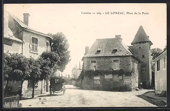 AK Le Lonzac, Place de la Poste avec calèche et bâtiments historiques