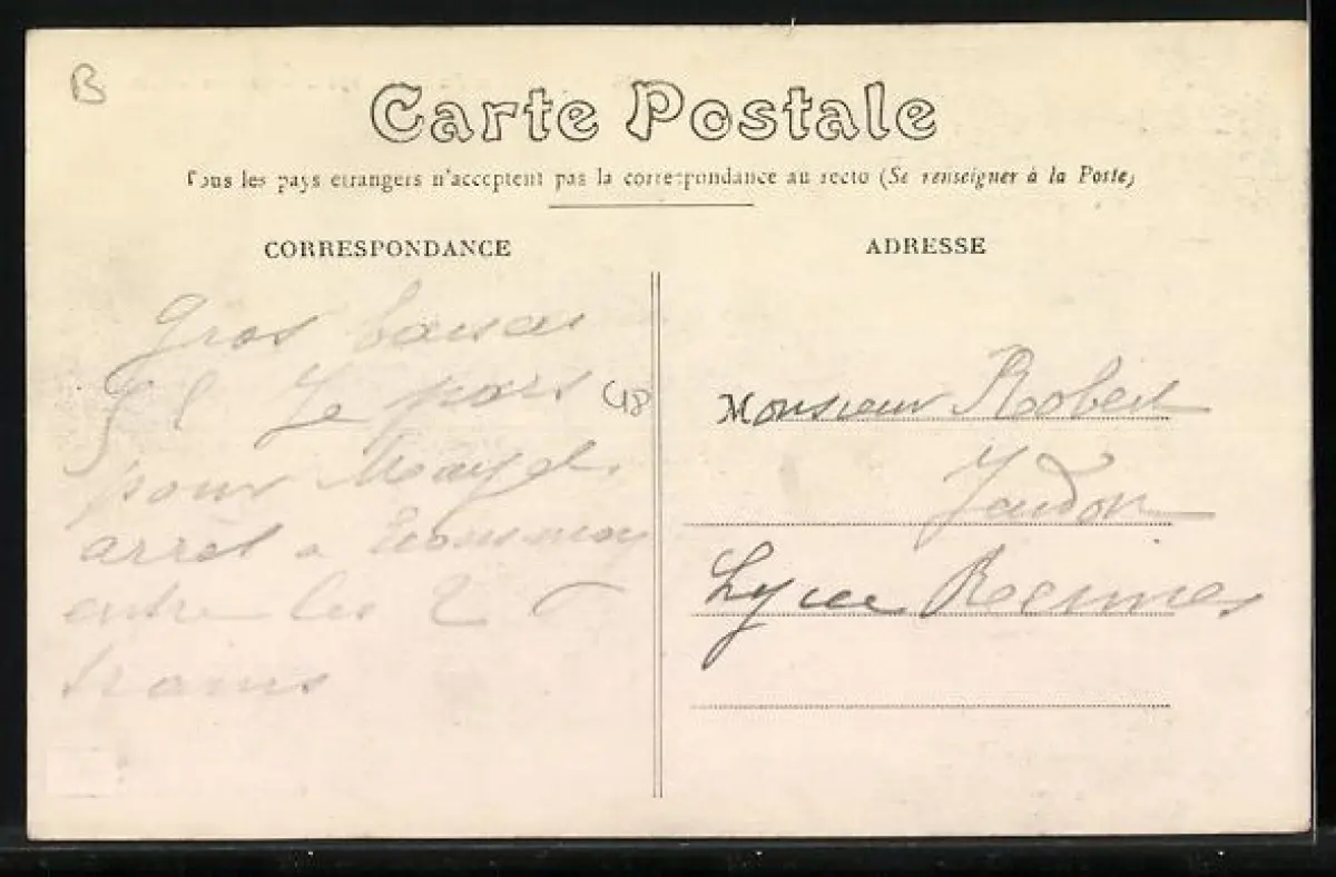 Personenbezogene Daten auf der Rückseite der Karte wurden durch blauen Textmarker unkenntlich gemacht. Die blauen Stellen sind auf die Vorderseite durchgeweicht und wirken sich negativ auf das Postkartenfoto aus