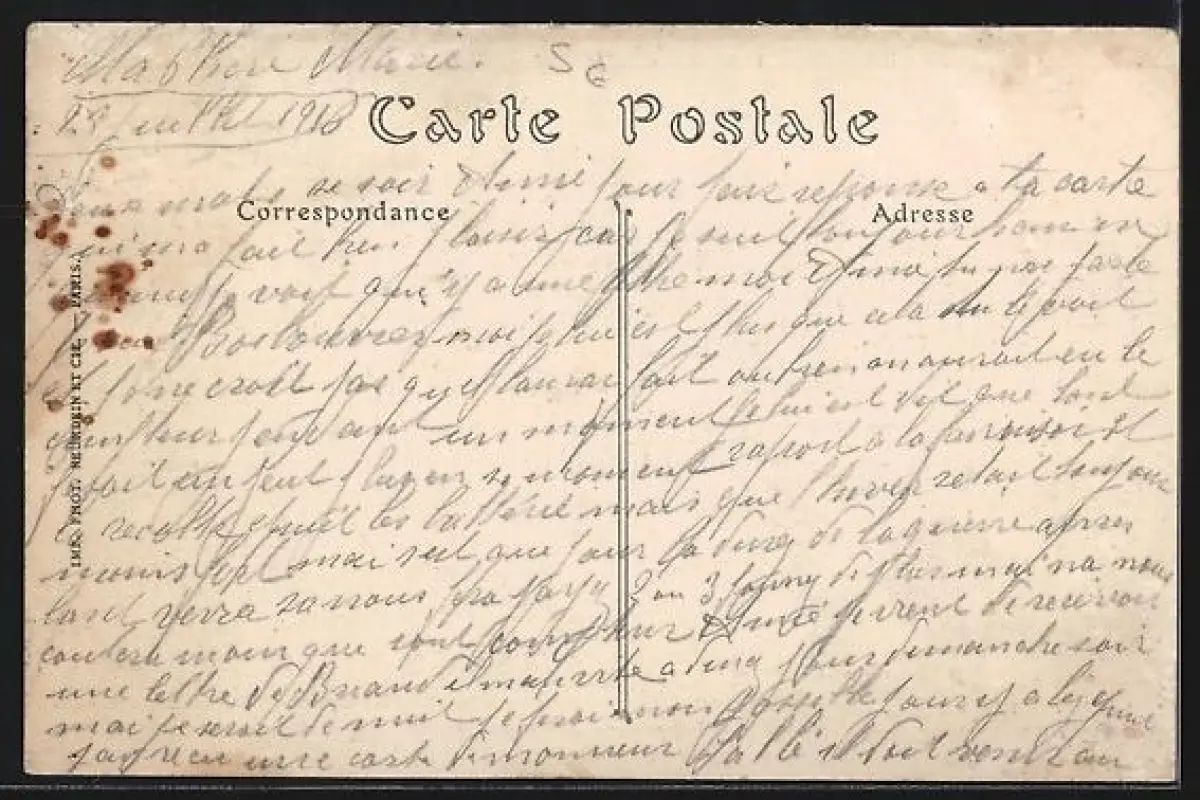 Personenbezogene Daten auf der Rückseite der Karte wurden durch blauen Textmarker unkenntlich gemacht. Die blauen Stellen sind auf die Vorderseite durchgeweicht und wirken sich negativ auf das Postkartenfoto aus