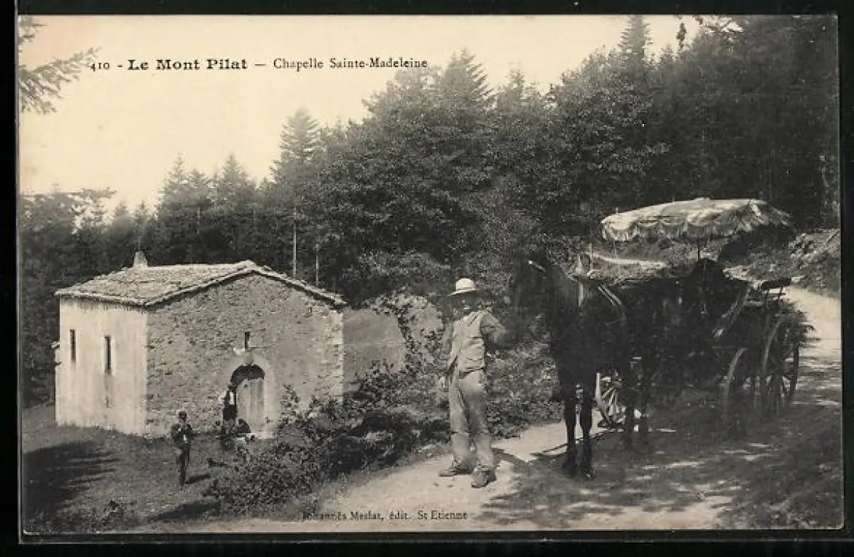 AK Le Mont Pilat, Chapelle Sainte-Madeleine et calèche dans la forêt