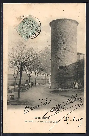 AK Le Muy, La Tour Charles-Quint avec route bordée d`arbres