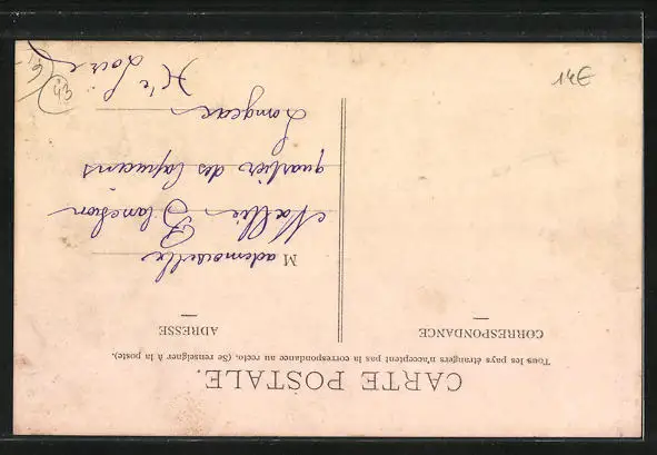 Personenbezogene Daten auf der Rückseite der Karte wurden durch blauen Textmarker unkenntlich gemacht. Die blauen Stellen sind auf die Vorderseite durchgeweicht und wirken sich negativ auf das Postkartenfoto aus
