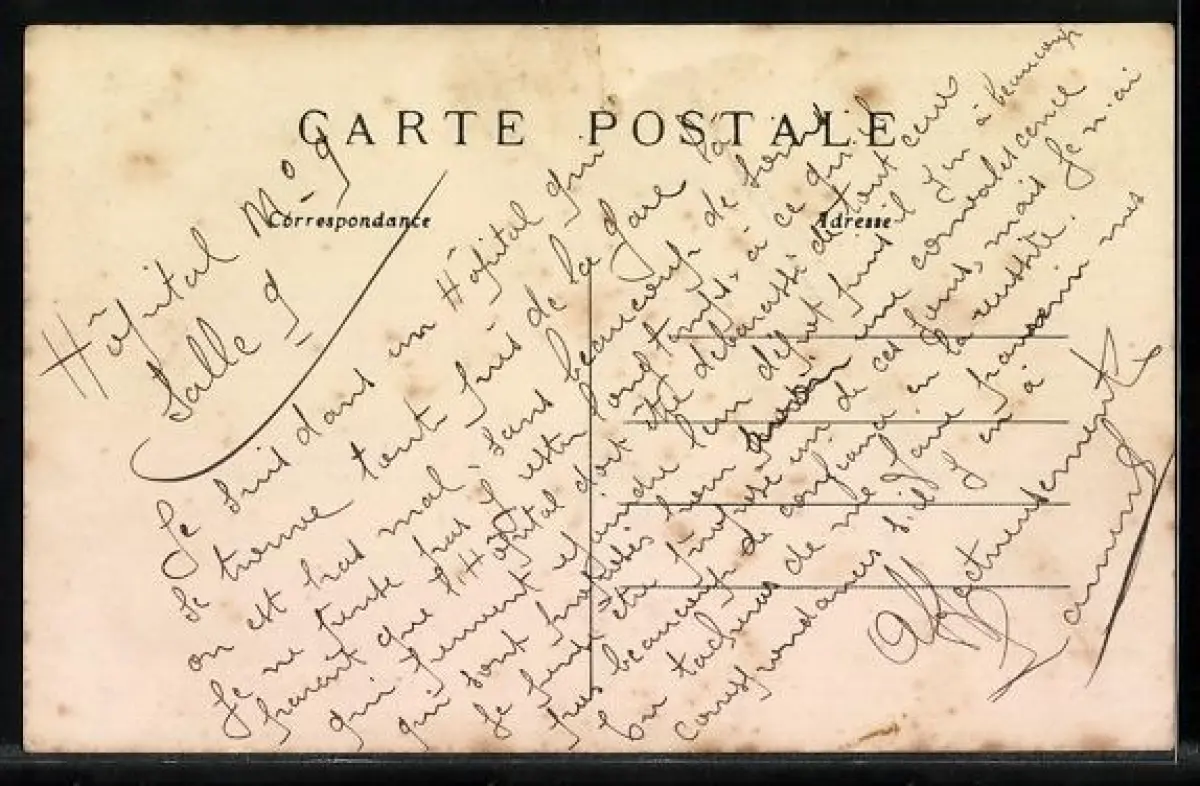 Personenbezogene Daten auf der Rückseite der Karte wurden durch blauen Textmarker unkenntlich gemacht. Die blauen Stellen sind auf die Vorderseite durchgeweicht und wirken sich negativ auf das Postkartenfoto aus