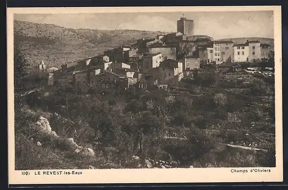 AK Le Revest-les-Eaux, Champs d`Oliviers et vue du village en arrière-plan