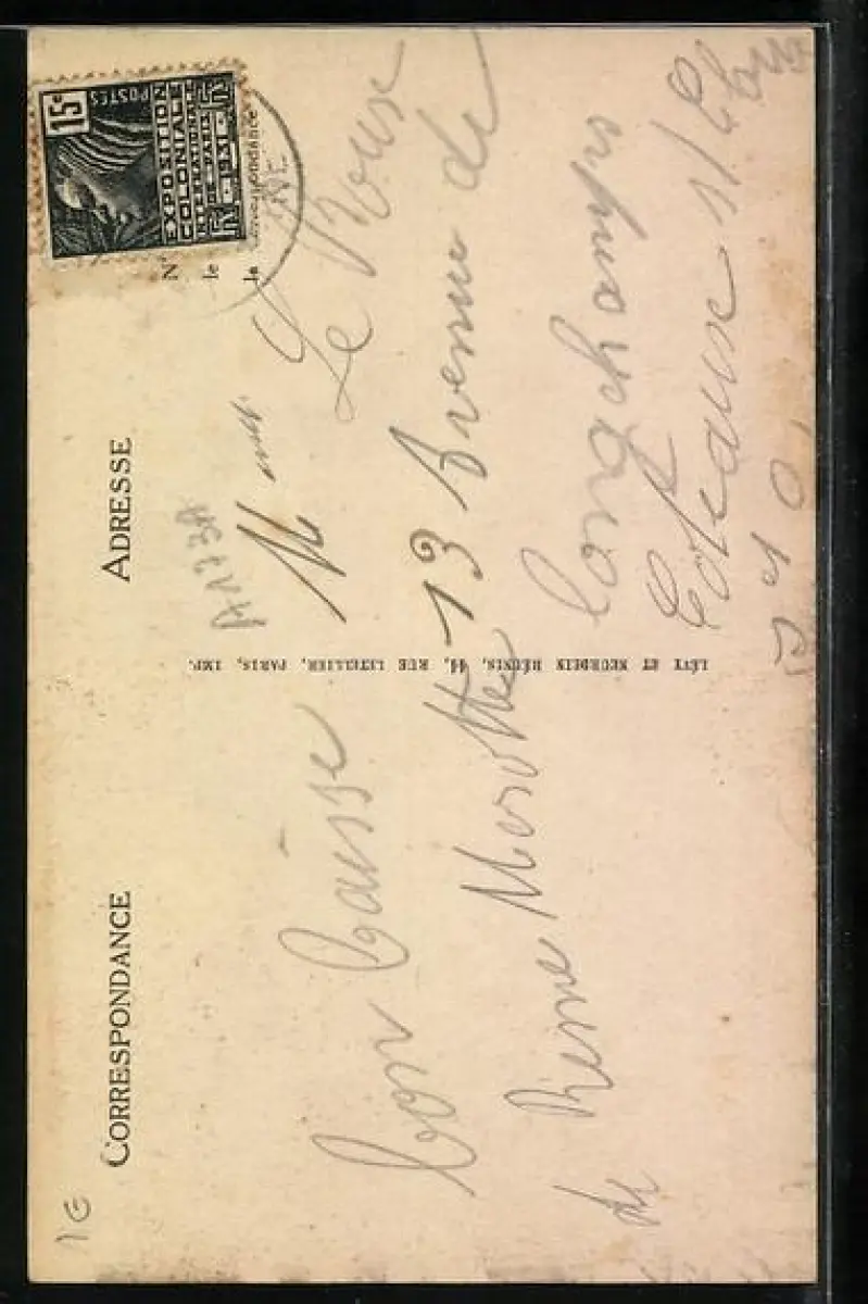 Personenbezogene Daten auf der Rückseite der Karte wurden durch blauen Textmarker unkenntlich gemacht. Die blauen Stellen sind auf die Vorderseite durchgeweicht und wirken sich negativ auf das Postkartenfoto aus