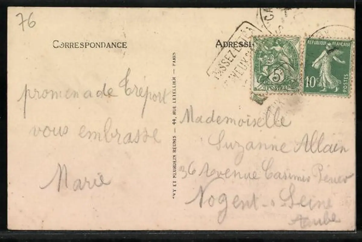 Personenbezogene Daten auf der Rückseite der Karte wurden durch blauen Textmarker unkenntlich gemacht. Die blauen Stellen sind auf die Vorderseite durchgeweicht und wirken sich negativ auf das Postkartenfoto aus
