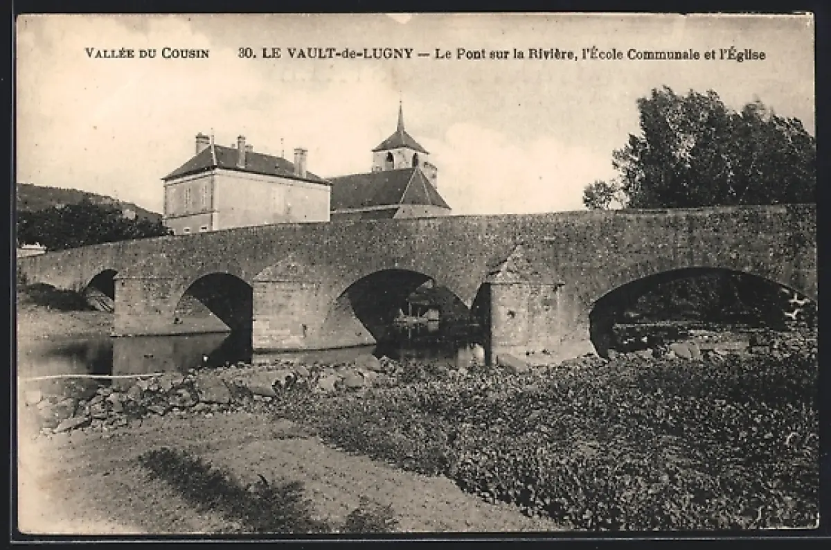 AK Le Vault-de-Lugny, Le Pont sur la Rivière, l`École Communale et l`Église