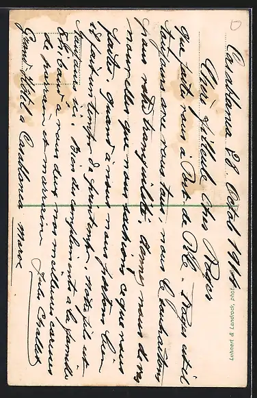 Personenbezogene Daten auf der Rückseite der Karte wurden durch blauen Textmarker unkenntlich gemacht. Die blauen Stellen sind auf die Vorderseite durchgeweicht und wirken sich negativ auf das Postkartenfoto aus