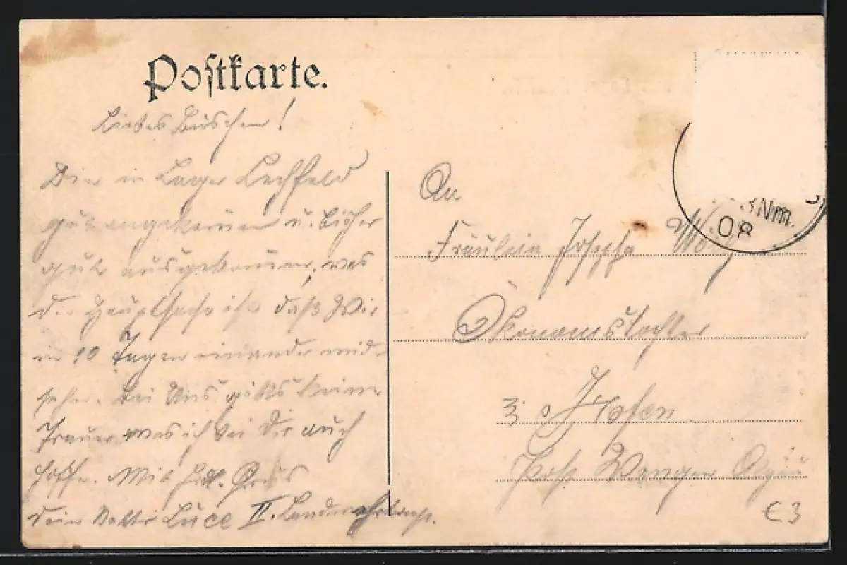 alte Ansichtskarte, gelaufen, Briefmarke entfernt, rückseitig Oberflächenschaden, guter Zustand