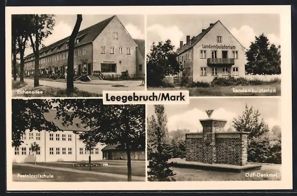 AK Leegebruch, Eichenallee, Pestalozzischule, OdF-Denkmal, Landambulatorium