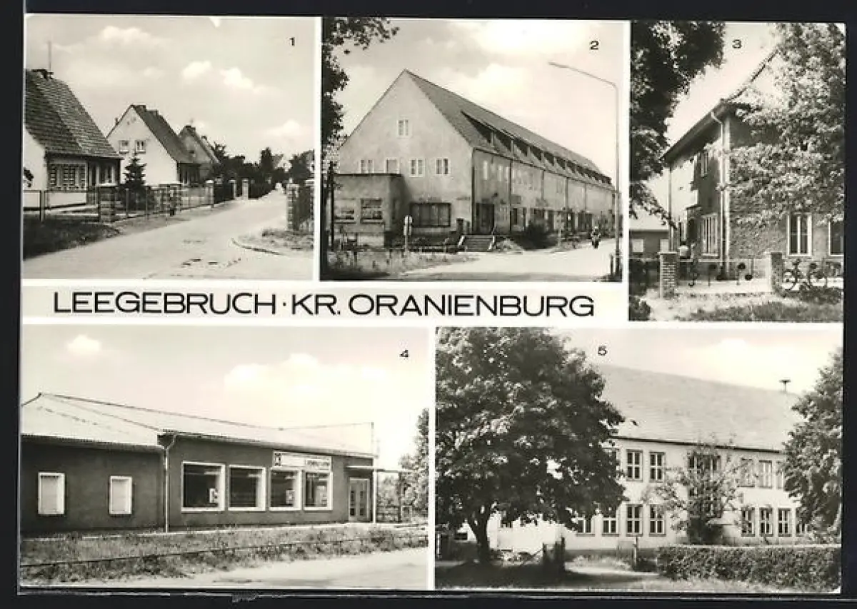 AK Leegebruch /Oranienburg, Karl-Marx-Strasse, Eichenallee, Volkshaus, Konsum-Kaufhalle, Oberschule