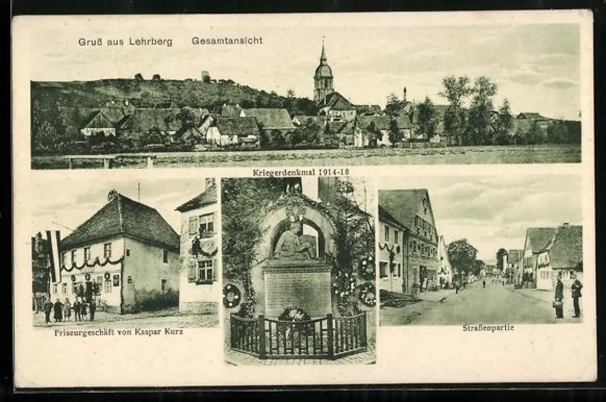 AK Lehrberg, Friseurgeschäft Kaspar Kurz, Kriegerdenkmal, Strassenpartie, Gesamtansicht