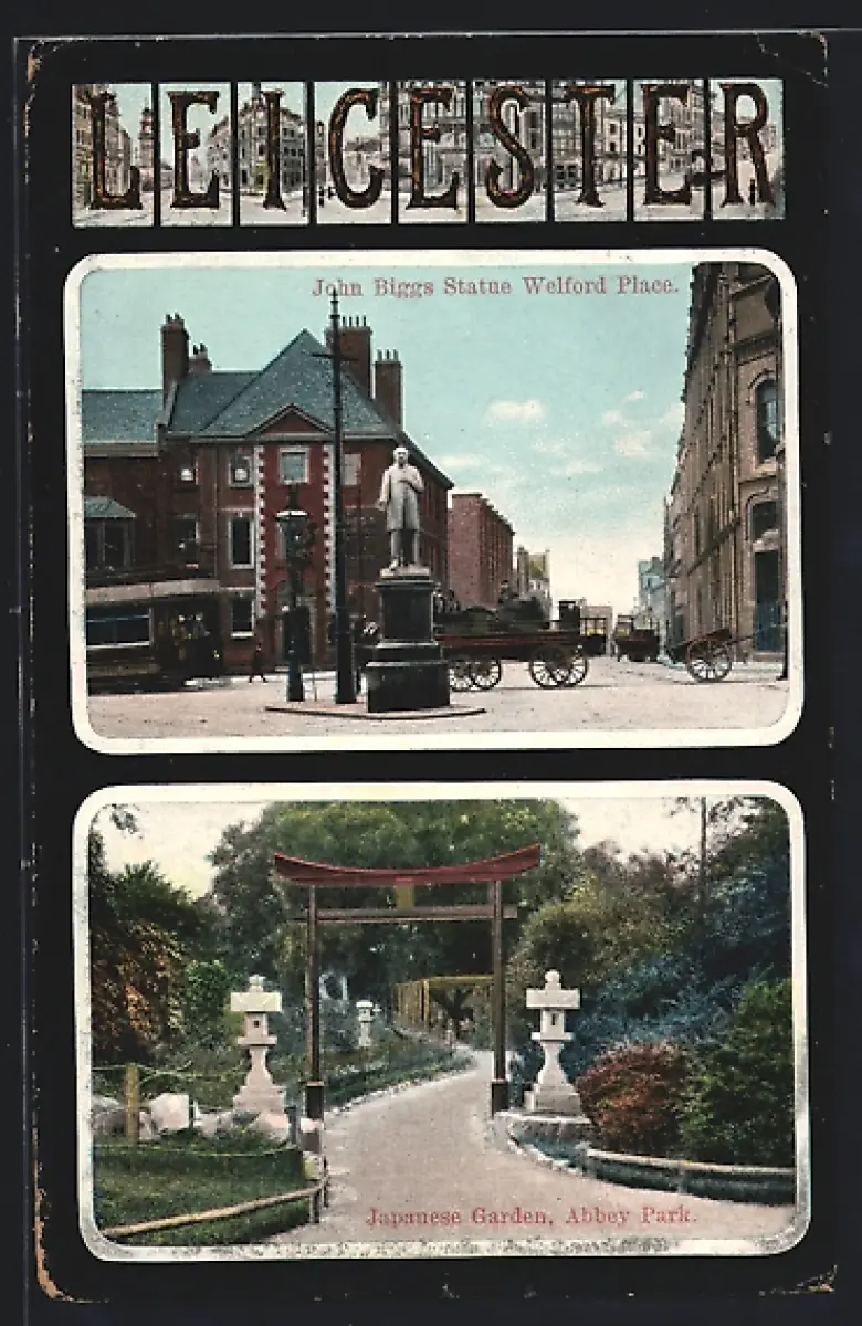 AK Leicester, John Biggs Statue Welford Place, Japanese Garden, Abbey Park
