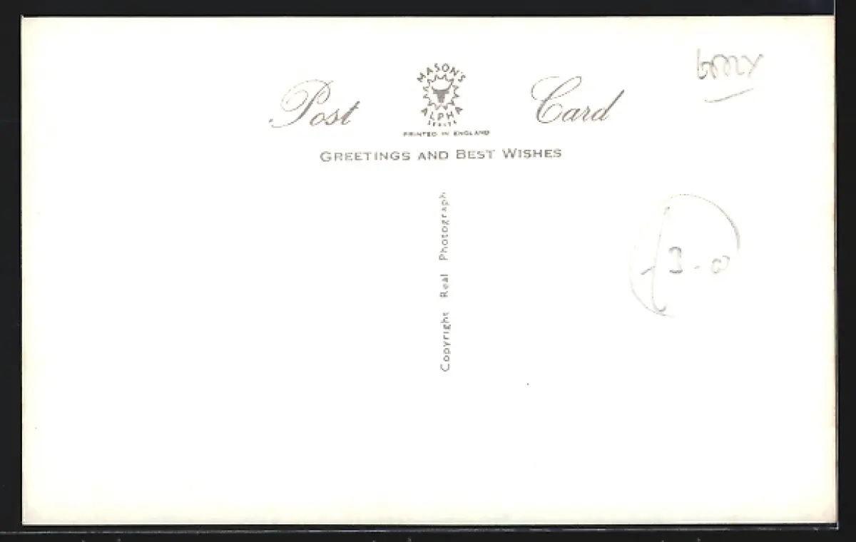 Personenbezogene Daten auf der Rückseite der Karte wurden durch blauen Textmarker unkenntlich gemacht. Die blauen Stellen sind auf die Vorderseite durchgeweicht und wirken sich negativ auf das Postkartenfoto aus
