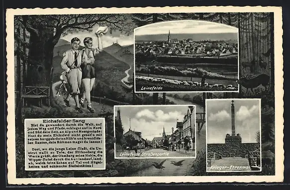 AK Leinefelde, Ortsansicht, Strassenpartie, Krieger-Ehrenmal, Wanderer mit Eichsfelder Sang