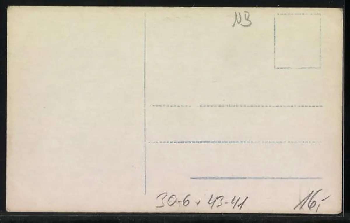 Personenbezogene Daten auf der Rückseite der Karte wurden durch blauen Textmarker unkenntlich gemacht. Die blauen Stellen sind auf die Vorderseite durchgeweicht und wirken sich negativ auf das Postkartenfoto aus