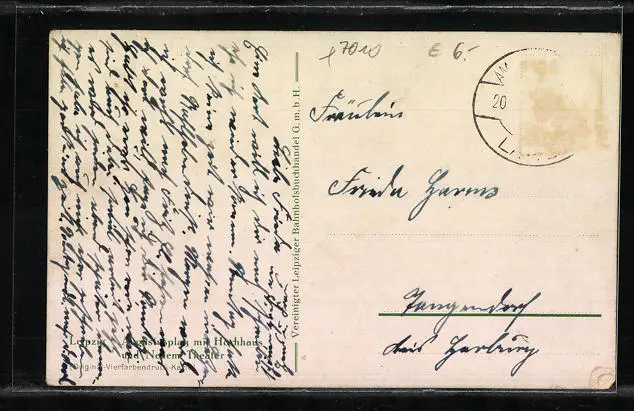 Personenbezogene Daten auf der Rückseite der Karte wurden durch blauen Textmarker unkenntlich gemacht. Die blauen Stellen sind auf die Vorderseite durchgeweicht und wirken sich negativ auf das Postkartenfoto aus