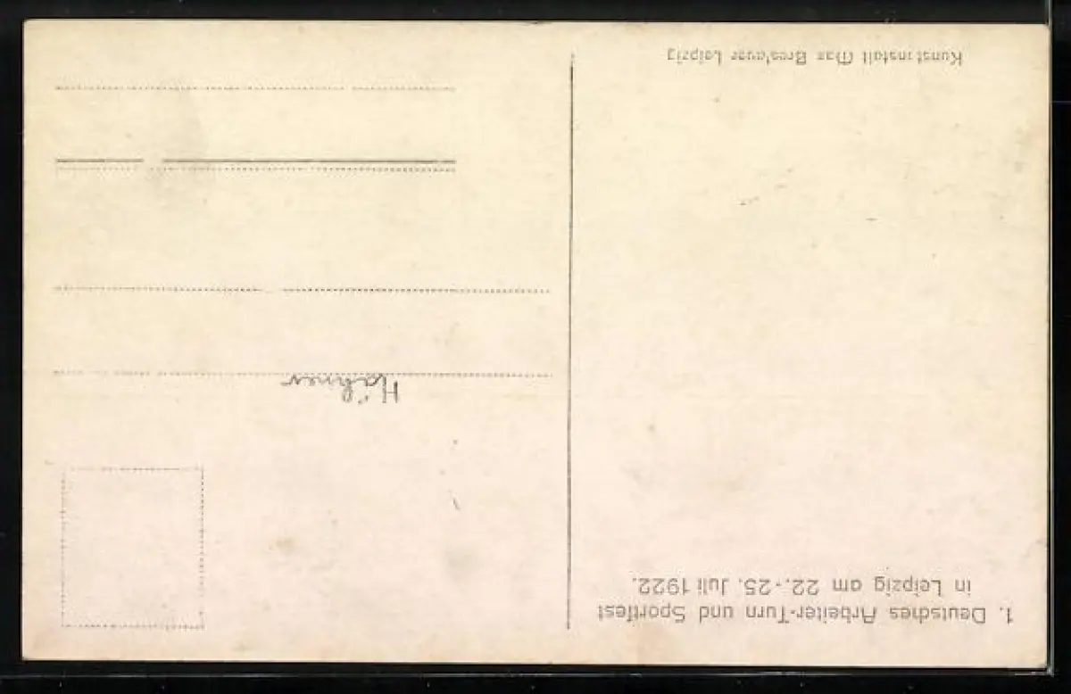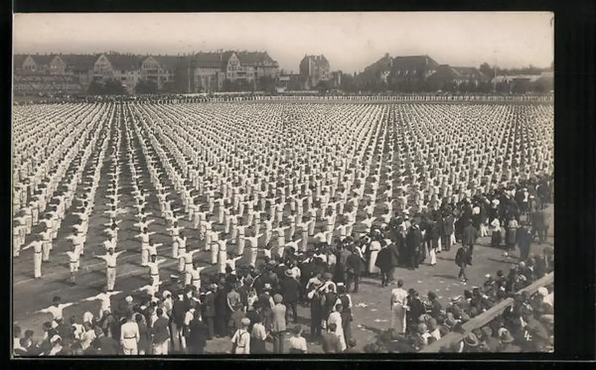 AK Leipzig, Deutsches Arbeiter-Turn- und Sportfest 1922, Formationsgymnastik auf dem Sportplatz, mit Stadtpanorama
