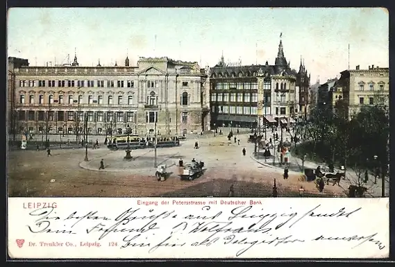 AK Leipzig, Eingang der Peterstrasse mit Deutscher Bank, Strassenbahn, Lifasssäule