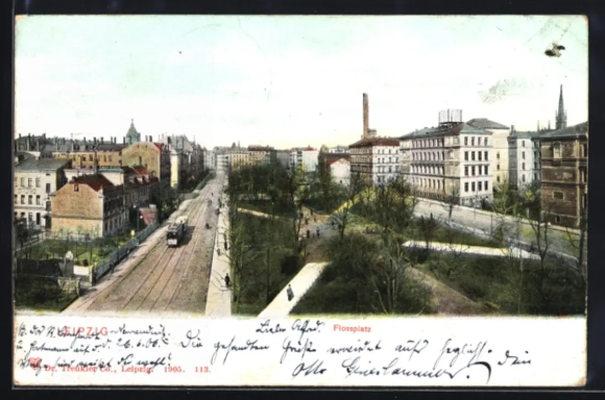 AK Leipzig, Flossplatz, Strassenbahn, Wohnhäuser