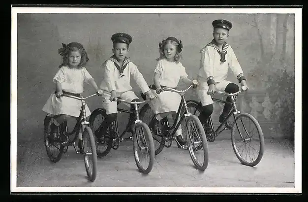 AK Leipzig Gohlis, Adalbert Poethke Gothaer Str. 34, vier Kinder in maritimer Kleidung auf Fahrrädern