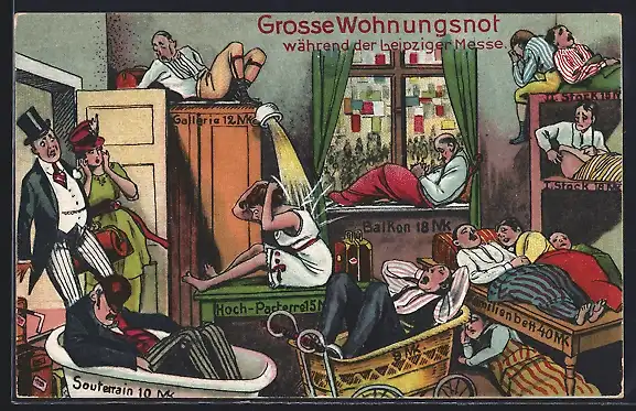 AK Leipzig, Grosse Wohnungsnot während der Leipziger Messe, Karikatur