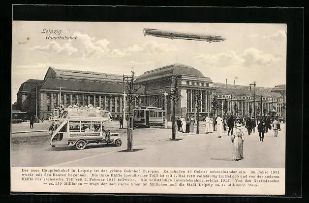 AK Leipzig, Hauptbahnhof mit Strassenbahn, Omnibus und überfliegendem Zeppelin