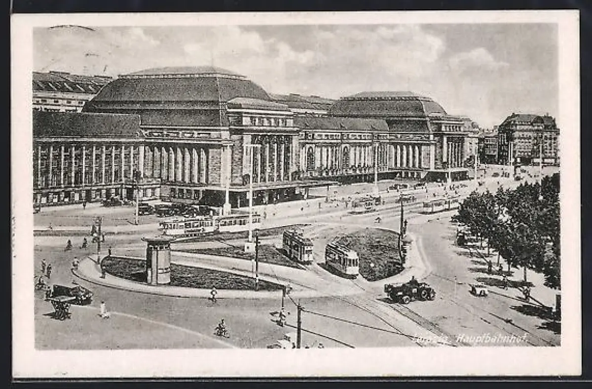 AK Leipzig, Hauptbahnhof mit Strassenbahnen