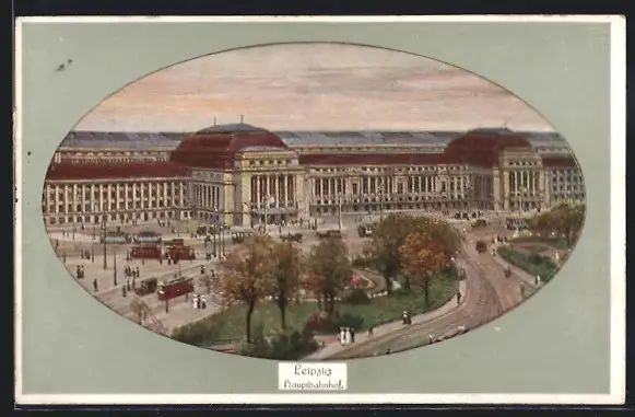 AK Leipzig, Hautpbahnhof mit Strassenbahn, Passpartout