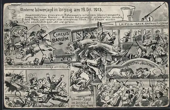 AK Leipzig, Jagd der entflohenen Löwen des Zirkus Barum am 19.10.1913