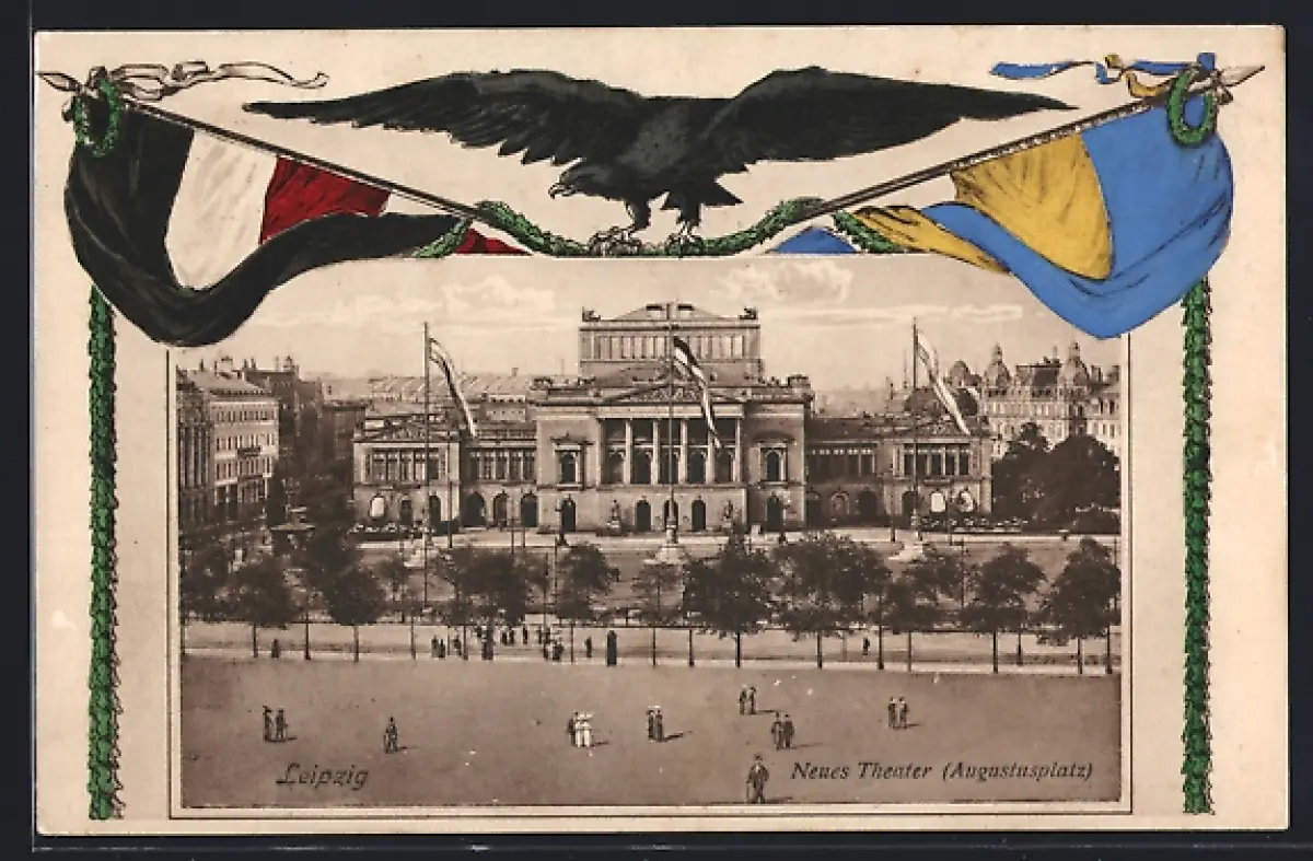 AK Leipzig, Neues Theater am Augustusplatz, schwarz-weiss-rote Fahne und Adler