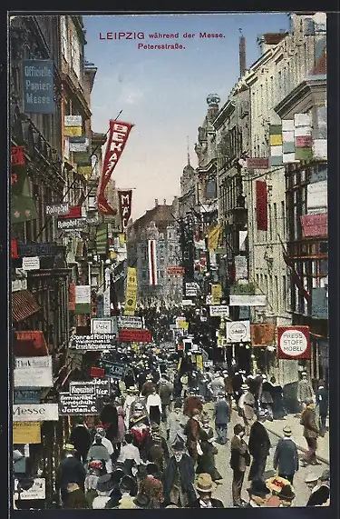 AK Leipzig, Petersstrasse mit Geschäften während der Messe