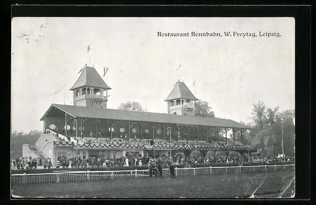 AK Leipzig, Restaurant Rennbahn W. Freytag, Tribüne der Rennbahn mit Publikum