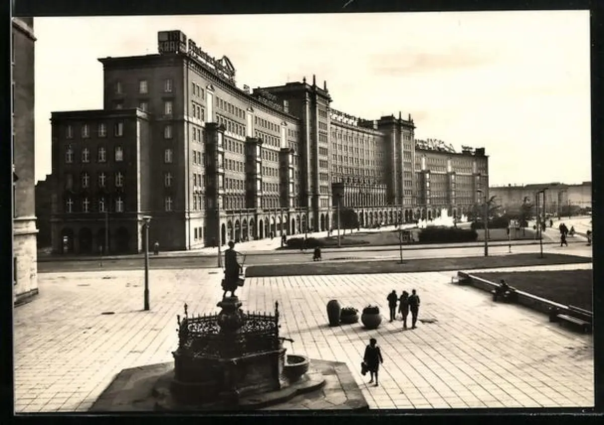 AK Leipzig, Ringbebauung mit Denkmal und Passanten