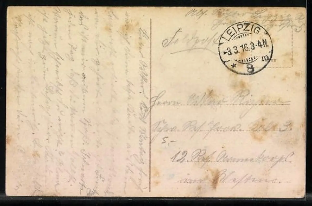 Personenbezogene Daten auf der Rückseite der Karte wurden durch blauen Textmarker unkenntlich gemacht. Die blauen Stellen sind auf die Vorderseite durchgeweicht und wirken sich negativ auf das Postkartenfoto aus