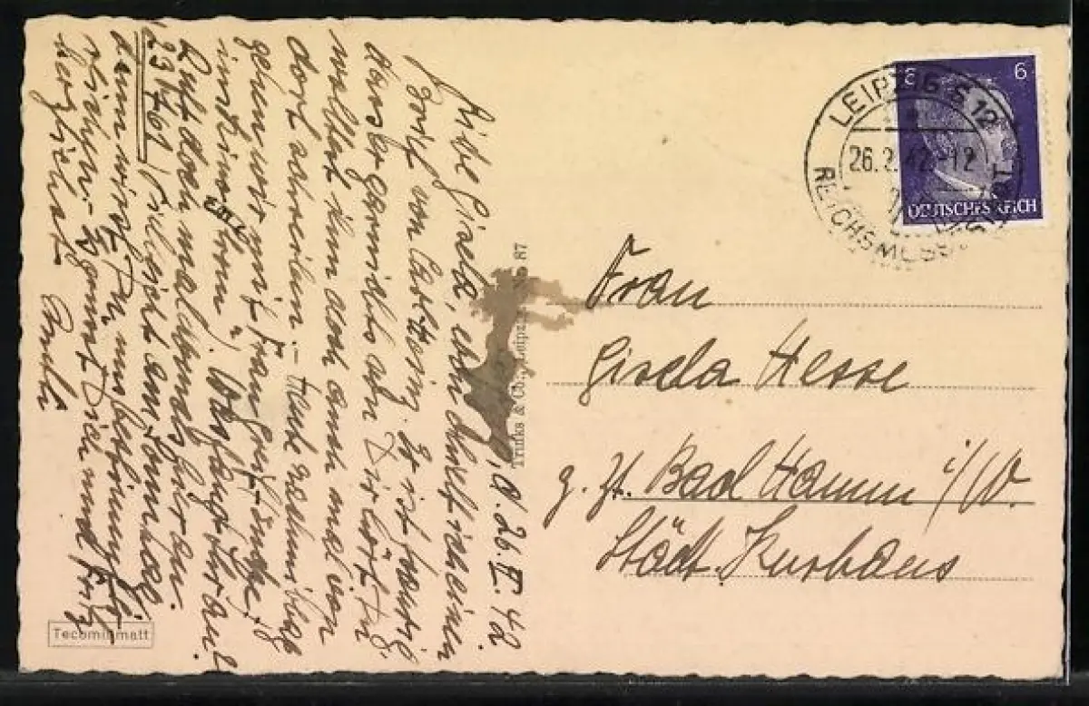 alte Ansichtskarte, gelaufen 1942, Bugspur oben links, guter Zustand