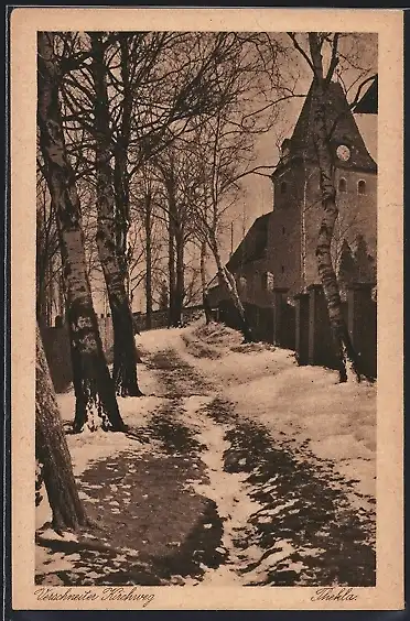 AK Leipzig-Thekla, Verschneiter Kirchweg mit Kirche