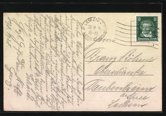 Personenbezogene Daten auf der Rückseite der Karte wurden durch blauen Textmarker unkenntlich gemacht. Die blauen Stellen sind auf die Vorderseite durchgeweicht und wirken sich negativ auf das Postkartenfoto aus