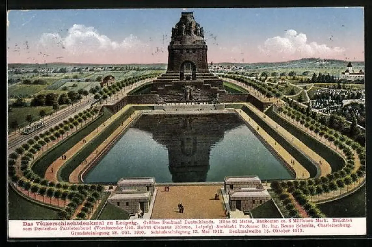 AK Leipzig, Völkerschlachtdenkmal aus der Vogelschau mit Fernblick