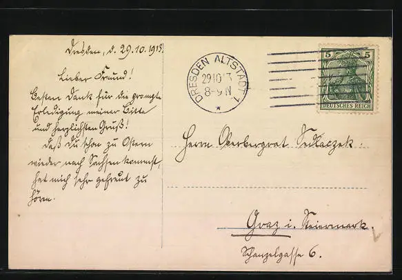 gelaufen 1913, Eckknicke li. unten und re. oben, guter Zustand