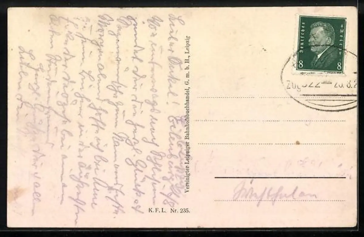 Personenbezogene Daten auf der Rückseite der Karte wurden durch blauen Textmarker unkenntlich gemacht. Die blauen Stellen sind auf die Vorderseite durchgeweicht und wirken sich negativ auf das Postkartenfoto aus