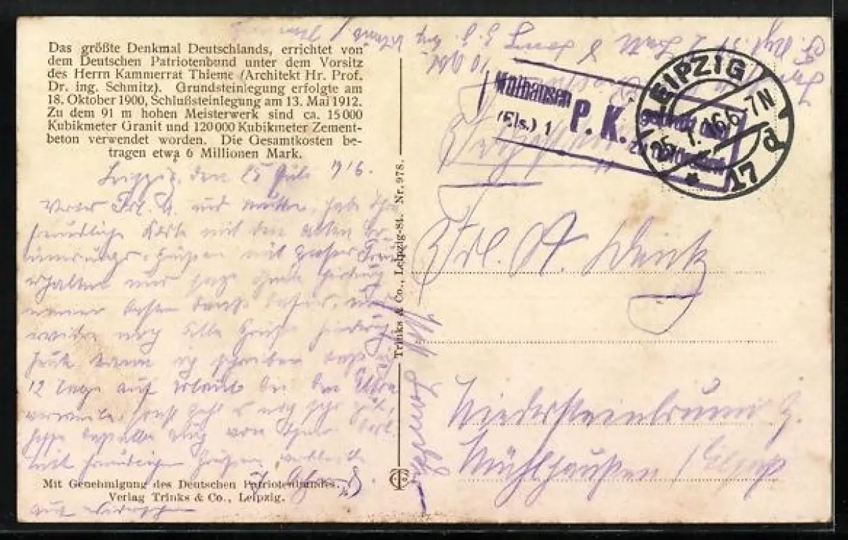 Personenbezogene Daten auf der Rückseite der Karte wurden durch blauen Textmarker unkenntlich gemacht. Die blauen Stellen sind auf die Vorderseite durchgeweicht und wirken sich negativ auf das Postkartenfoto aus