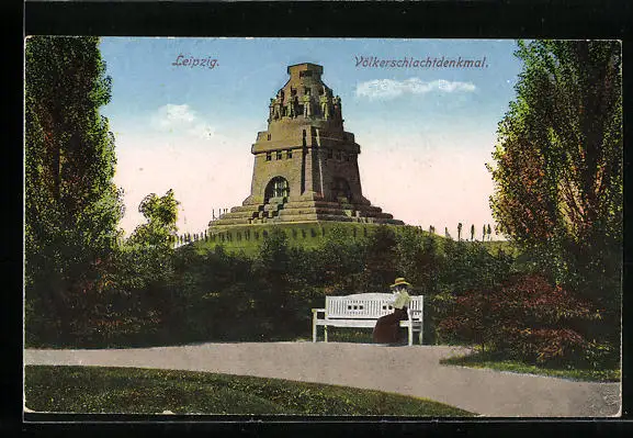 AK Leipzig, Völkerschlachtdenkmal mit Dame auf einer Bank