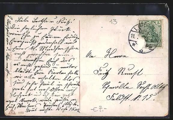 alte Ansichtskarte, gelaufen, Briefmarke entfernt, Bugspuren oben mittig und re., Ecken bestoßen li.