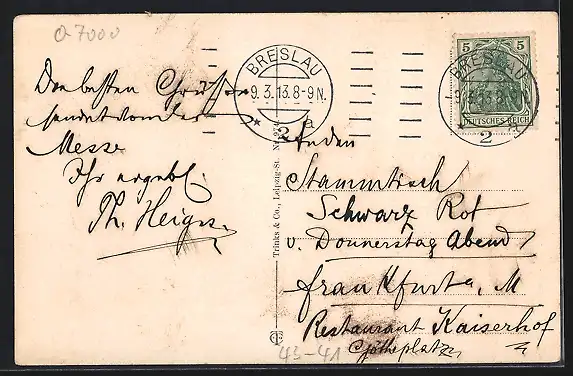 alte Ansichtskarte, gelaufen 1913, Eckknick li. oben, Bugspur li. diagonal, kleiner Einriss oben mittig, guter Zustand