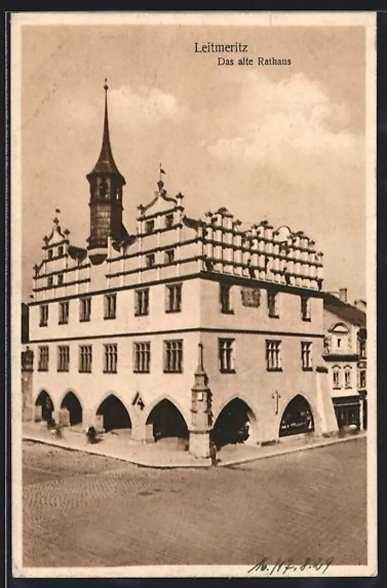 AK Leitmeritz / Litomerice, Strassenpartie mit altem Rathaus