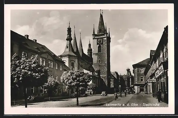 AK Leitmeritz-Litomerice a.d.Elbe, Stadtkirche, Automobile, Geschäfte