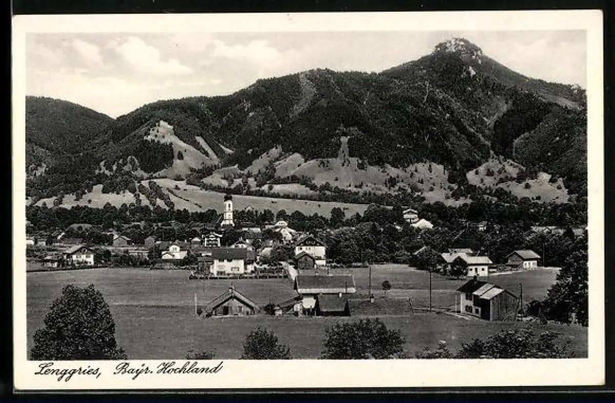 AK Lenggries, Bay., Ortsansicht mit Kirche und Bergen